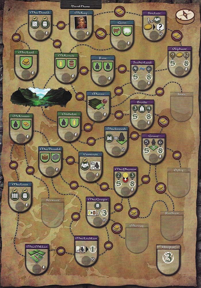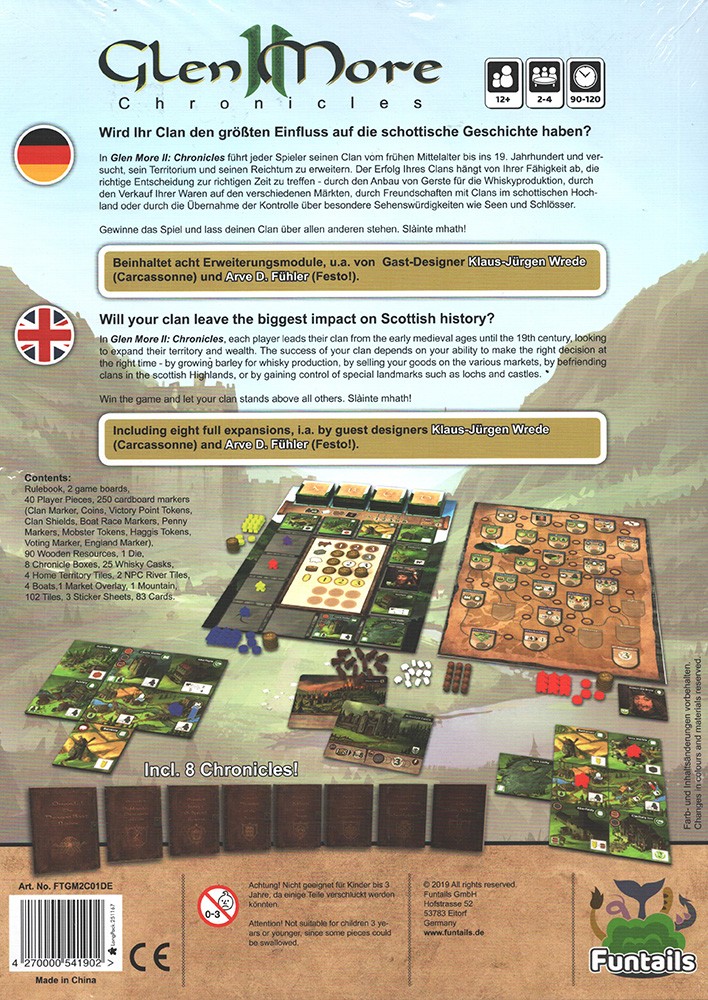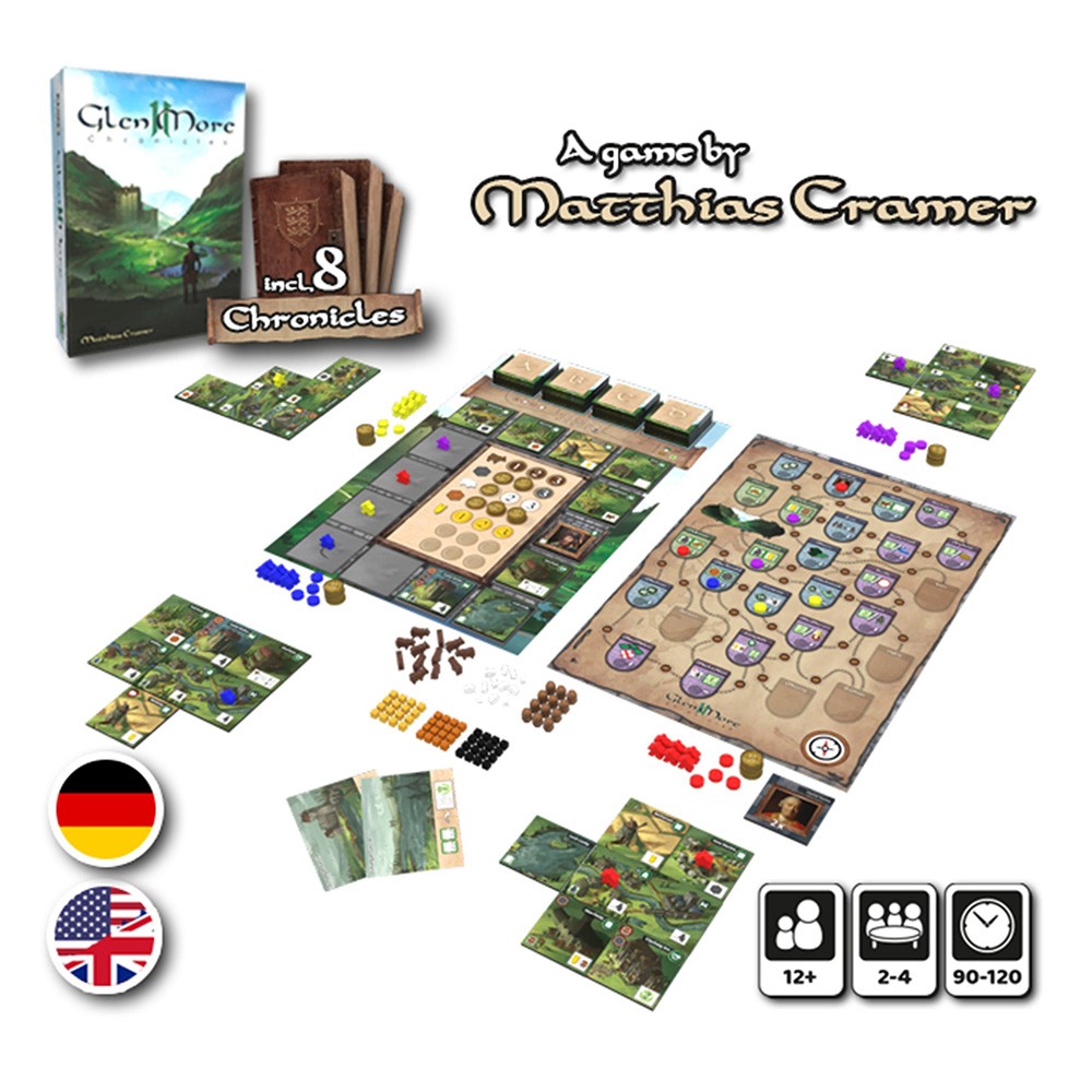 In Glen More II: Chroniclesführt jeder Spieler seinen Clan vom frühen Mittelalter bis ins 19. Jahrhundert und versucht, sein Territorium und seinen Reichtum zu erweitern. Der Erfolg deines Clans hängt von Ihrer Fähigkeit ab, die richtige Entscheidung zur richtigen Zeit zu treffen – durch den Anbau von Gerste für die Whiskyproduktion, durch den Verkauf deiner Waren auf den verschiedenen Märkten, durch Freundschaften mit Clans im schottischen Hochland oder durch die Übernahme der Kontrolle über besondere Sehenswürdigkeiten wie Seen und Schlösser. Gewinne das Spiel und lass deinen Clan über allen anderen stehen. Slàinte mhath!