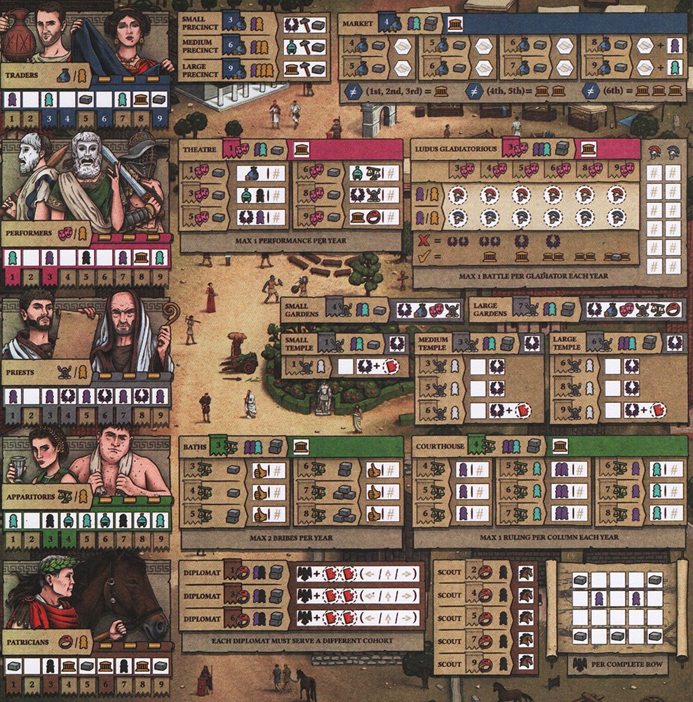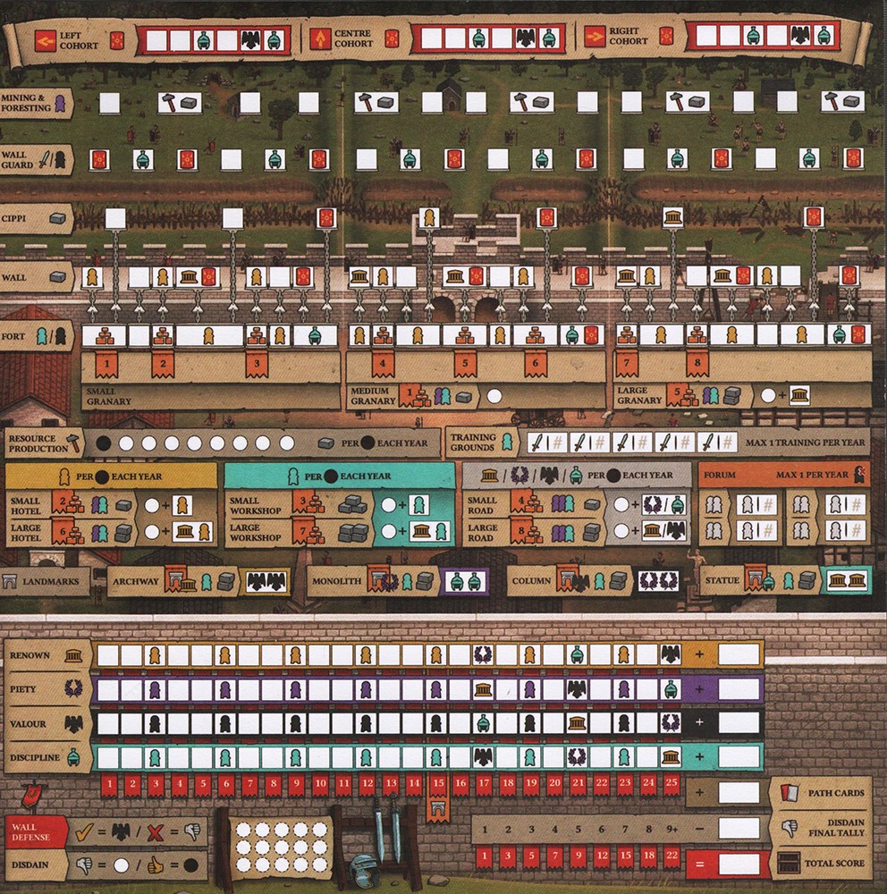 In Hadrian’s Wallplayers take on the role of a Roman General, placed in charge of the construction of a milecastle and bordering wall. Over 6 years (rounds), players will construct their fort and wall, man the defences, and attract civilians by building services and providing entertainment – all while defending the honour of the Roman Empire from the warring Picts. The player that can accumulate the most Renown, Piety, Valour and Discipline, whilst avoiding Disdain, will prove to the Emperor they are the model Roman citizen and be crowned Legatus Legionis!
