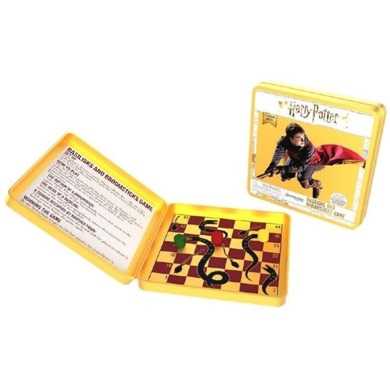Dieses Spiel ist ideal zum Mitnehmen für unterwegs oder für einen Spieleabend zu Hause. Rollen Sie abwechselnd die Würfel und bewegen Sie Ihren magnetischen Läufer. Seien Sie vorsichtig mit einem speziellen Quadrat mit einem Basilisken oder einem Besen. Stundenlanger Spaß ist garantiert!