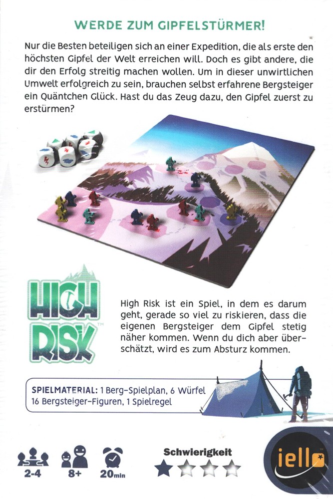 High Riskist ein Spiel, in dem es darum geht, gerade so viel zu riskieren, dass die eigenen Bergsteigerdem Gipfel stetig näher kommen. Wenn du dich aber überschätzt, wird es zum Absturz kommen.