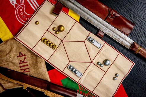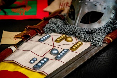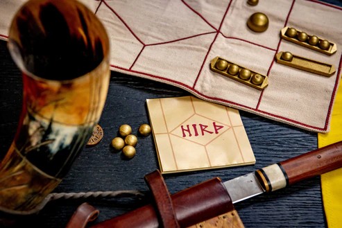 HIRÞ(pronounced hirth) is a two-player abstract strategy game in which two leaders (Viking kings) fight over control of a piece of land. The first to either control the five middle spaces or push the other player’s king off the board wins. Although it has a relatively small board (eleven squares), the ability to use moves to build stronger units makes the gameplay quite intricate. The game is designed in recent times but with the ambition of resembling a game that could potentially have been found in a Viking grave.