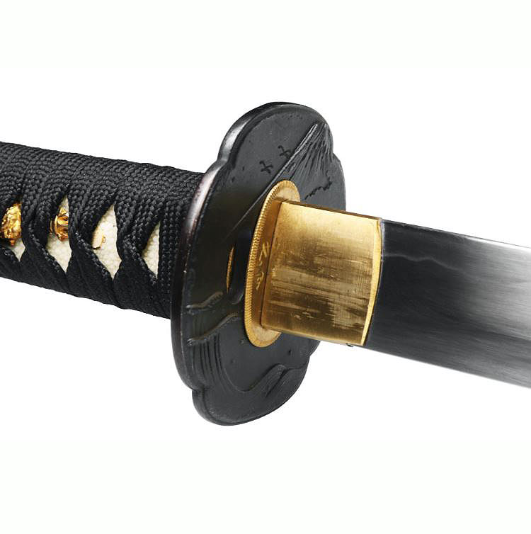 Koshirae: Das Habaki besteht aus Messing mit Messingseppa und einem Dragon Tsuba aus geschwärztem 1045 Stahl. Der Tsuka-Griff hat die Form einer traditionellen Rikko-Form (Sanduhr) und eine sanfte Krümmung, um die Ergonomie zu unterstützen. Die Fuchi und Kashira bestehen aus geschwärztem Eisen mit Menuki aus einer Metalllegierung. Die schwarze Baumwolle ito ist über weißem Samegawa aus echtem Rochenleder gewickelt.