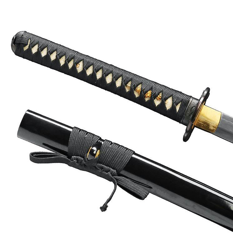 Die Saya hat einen schwarzen Glanz. Es verfügt über einen dicken schwarzen Chemiefaser-Sageo.