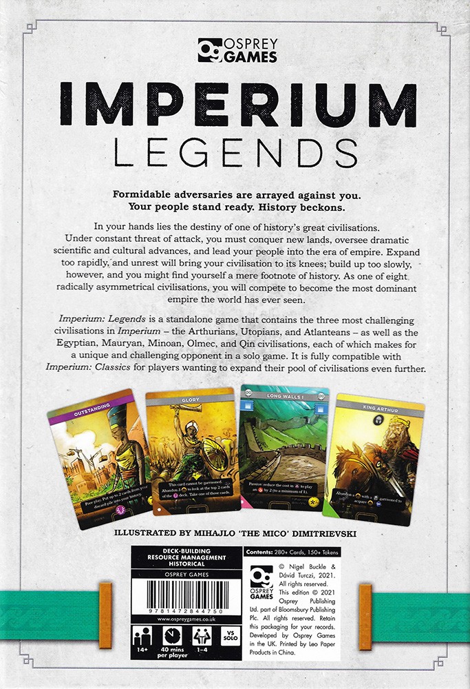 Imperium: Legendsis a standalone game that contains the Arthurian, Atlantian, Egyptian, Mauryan, Minoan, Olmec, Qin, and Utopian civilizations and an individual solo opponent behaving as each nation. It is also fully compatible with Imperium: Classics for players wanting to expand their pool of civilizations even further.