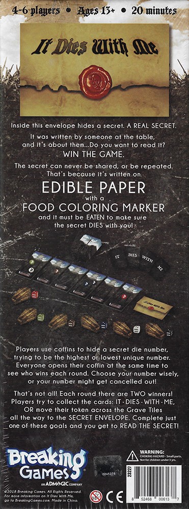 In most games – even your favorite one – there’s nothing really serious at stake. But, It Dies With Meis different. Take a peek into the soul; the deep, dark, twisted heart of your opponent. The player that wins, will learn a secret, something never told to anyone! One player at the table has a secret, and it’s about them. They’ve even written in down and placed it in a secret envelope on the table. Do you want to read it? WIN THE GAME. The secret can never be shared, or be repeated. That’s because it’s written on EDIBLE PAPER with a FOOD COLORING MARKER, and it must be EATEN to make sure the secret DIES with the winner of the game!