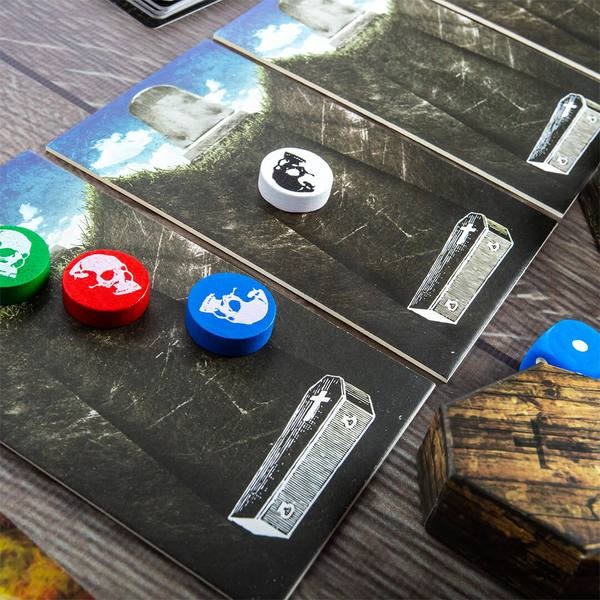 Each player (including the player whose secret is in the game) has one six sided die and a mini coffin. Players use their coffins to hide a secret die number they’ve chosen, trying to be the highest or lowest unique number. That’s right, no rolling of these dice. Players can choose any number from one to six. Everyone opens their coffin at the same time to see who wins each round. Choose wisely, or your number might get cancelled out!