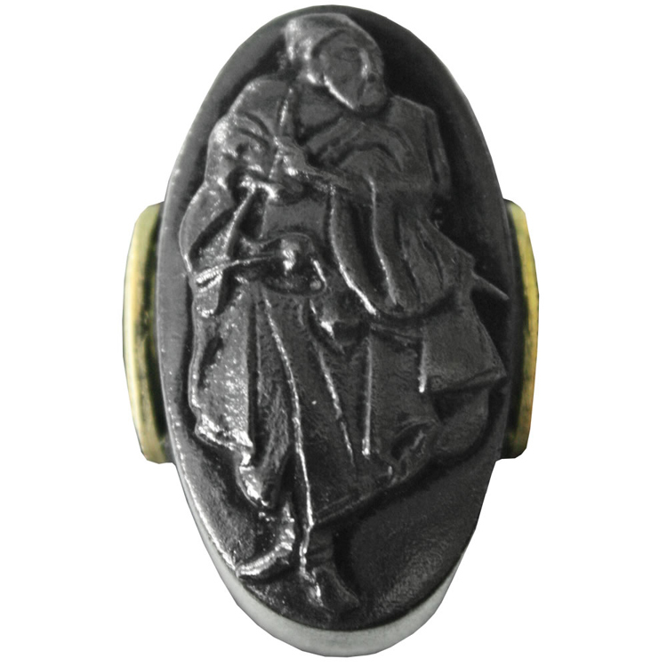 Ishikawa Goemon ein japanischer Folklore-Held. Ähnlich wie Robin Hood soll er die Reichen bestohlen und es den Armen gegeben haben. Die Tsuba zeigt Goemon bei seiner Hinrichtung nach einem Holzstich von Toyokuni Ichiyoai. Neben weiteren Motiven findet sich auf dem Fuchi auch sein Name in japanischer Schrift.