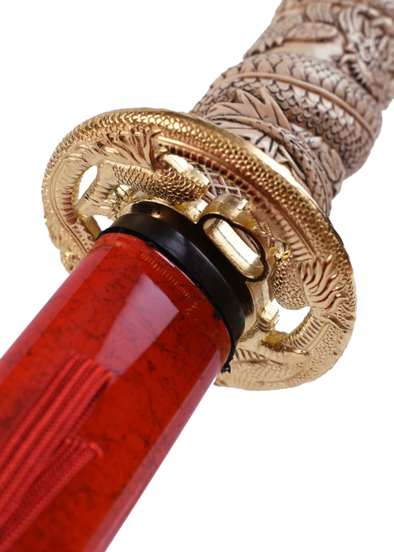 Katana Duncen MacLeodaus den Film Highlander mit roter Saya. Ausgestattet ist das Schwert mit dem charakteristisch gearbeiteten Drachen Griff und der goldenen Tsuba die ebenfalls einen Drachen darstellt.
