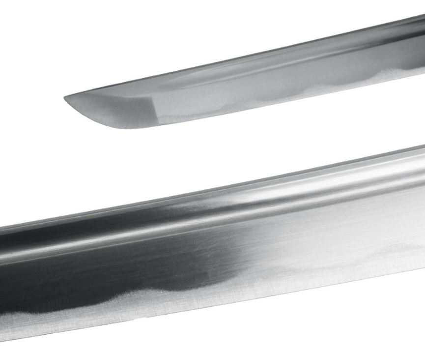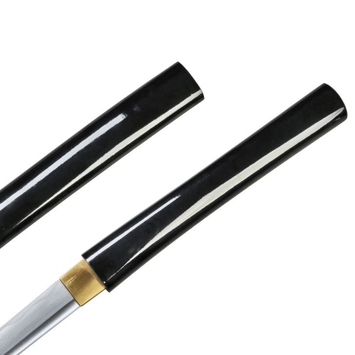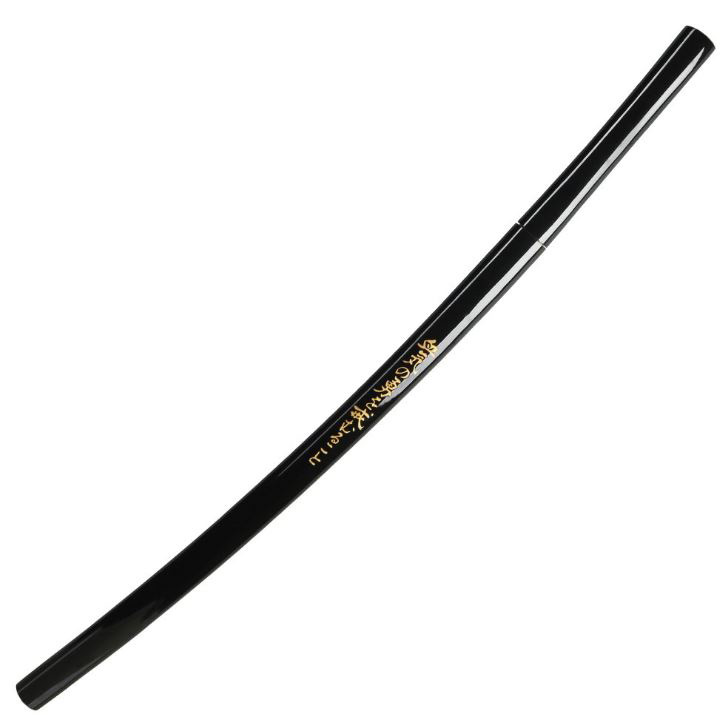 Katana Practical Bishamonmit Kanji Gravur in der Farbe schwarz mit 1045er Kohlenstoffstahl Klinge die von Hand gefertigt ist, so dass der Kohlenstoff gleichmäßig in der Klinge verteilt wird, um eine beständige Härte zu erreichen. Der Klinge wurde ein Bohi hinzugefügt, um das Gewicht der Klinge zu reduzieren und beim Schwenken hörbare Rückmeldung zu geben. Die Klinge besitzt eine Kanji Gravur. Die Saya des Schwertes ist aus Hartholz mit einer hochglänzenden Oberfläche versehen. Der Sageo ist schwarze Baumwolle