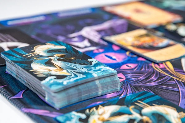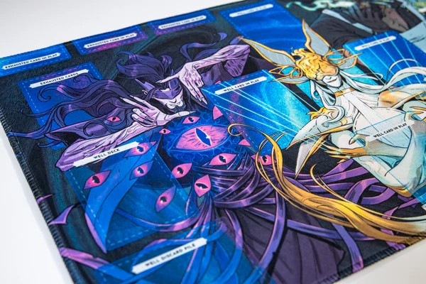 The playmatis designed for the Well Master you will be facing, it contains spots for your well deck, discard, exhausted cards, progress tokens, life counter, and the Well Master and their challenges.