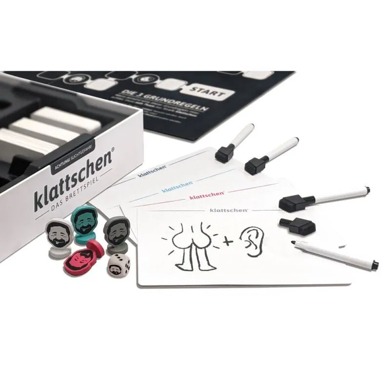 Das Klattschen-Brettspiel ist ein großartiges Partyspiel für einen geselligen und (un-)vergesslichen Abend mit Freunden. Ihr tretet in Teams gegeneinander an und müsst witzige und unanständige Begriffe zeichnen oder pantomimisch vorführen. Die Teampartner müssen den Begriff dann richtig erraten. Nur das Gewinner-Team darf vorrücken und das Team, welches zuerst das Ziel erreicht, gewinnt.