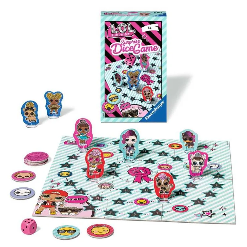 Surprise-Dice-Game, das ist ein spannendes Würfel-Wettlaufspiel voller Überraschungen für kleine und große L.O.L.-Fans! Dabei versuchen die Spieler, mit ihren Spielfiguren möglichst schnell das Ziel zu erreichen. Jeder Spieler erhält zwei Spielfiguren, ein L.O.L. Püppchen und das passende Haustier, die er über den kunterbunten Spielplan möglich schnell ins Ziel bringen möchte. Aber das möchten die Mitspieler auch und kennen daher keine Gnade, wenn sie die Möglichkeit haben, ihre Konkurrenten aus dem Rennen zu werfen! Unterwegs warten jedoch einige Überraschungen, die das Rennen jeder Zeit verändern können: Wer eine 6 würfelt, darf einen der 10 Überraschungs-Chips ziehen… diese können die Spieler an die Spitze des Rennens bringen, aber auch weit zurück werfen.Surprise-Dice-Game ist ein spannendes Würfel-Wettlaufspiel mit den beliebten L.O.L.-Figuren.