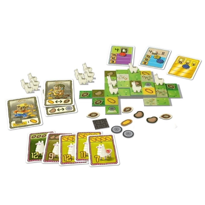 Es ist nicht einfach, ein Bauer zu sein, mit all den Hügeln und Bergen um einen herum. Als Bauer in einer Berglandschaft legen Sie Felder an, auf denen Sie Kakao, Mais und Kartoffeln anbauen. Sie werden auch Dorfbewohner einstellen, die Ihnen helfen, die größtmögliche Ernte zu erzielen. Mit der Ernte kaufst du Lamas, die Punkte wert sind. Neben dem Versuch, möglichst viele Lamas einzusammeln, sollte man auch auf spezielle Zielplättchen achten. Diese Zielplättchen geben dir Punkte, wenn du bestimmte Bedingungen erfüllst. Der Spieler mit den meisten Punkten gewinnt.
