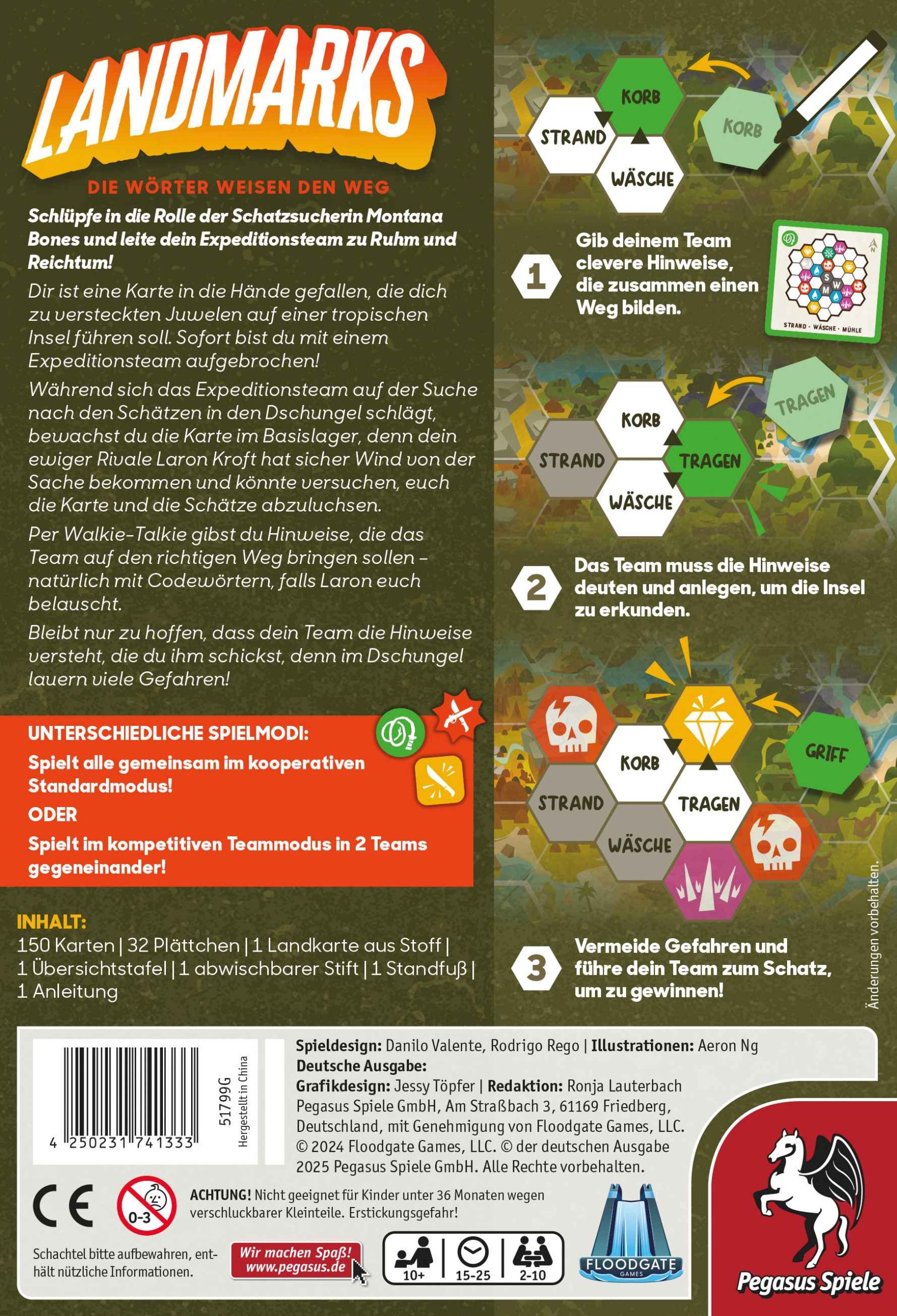 Montana Bones und ihr Expeditionsteam haben auf einer gefährlichen Schatzinsel ihr Camp aufgeschlagen. Gelingt es dem Expeditionsteam, den Fallen auszuweichen und die Juwelen zu finden, ohne verflucht zu werden? In dem assoziativen Wortspiel Landmarksbegeben sich die Spielenden gemeinsam als Expeditionsteam auf die gefährliche Suche nach Juwelen. Um sich den Weg durch den Dschungel zu bahnen, sind sie auf die Hilfe von Montana Bones angewiesen, die ihnen per Walkie-Talkie Hinweise durchgibt. Zu Beginn jeder Partie startet das Expeditionsteam mit drei Wortplättchen, an denen sie im Verlauf des Spiels weiter anlegen müssen. Eine Person, die Montana Bones verkörpert, beschriftet in jeder Runde ein neues Wortplättchen mit einem verschlüsselten Hinweis. Es ist dann Aufgabe des Teams herauszufinden, an welcher Stelle das Plättchen angelegt werden muss. Legt das Team ein Plättchen falsch an, könnten sie in eine Falle tappen, die sie wichtige Wortplättchen kostet, oder einen tödlichen Fluch auslösen. Die Mission ist nur dann gewonnen, wenn es dem Team gelingt, mit mindestens einem Juwel ins Camp zurückzukehren, bevor ihnen das Wasser ausgeht. Landmarkslässt sich kooperativ oder im kompetitiven Teammodus mit zwei Teams spielen, und enthält 150 Startkarten in drei verschiedenen Schwierigkeitsstufen.