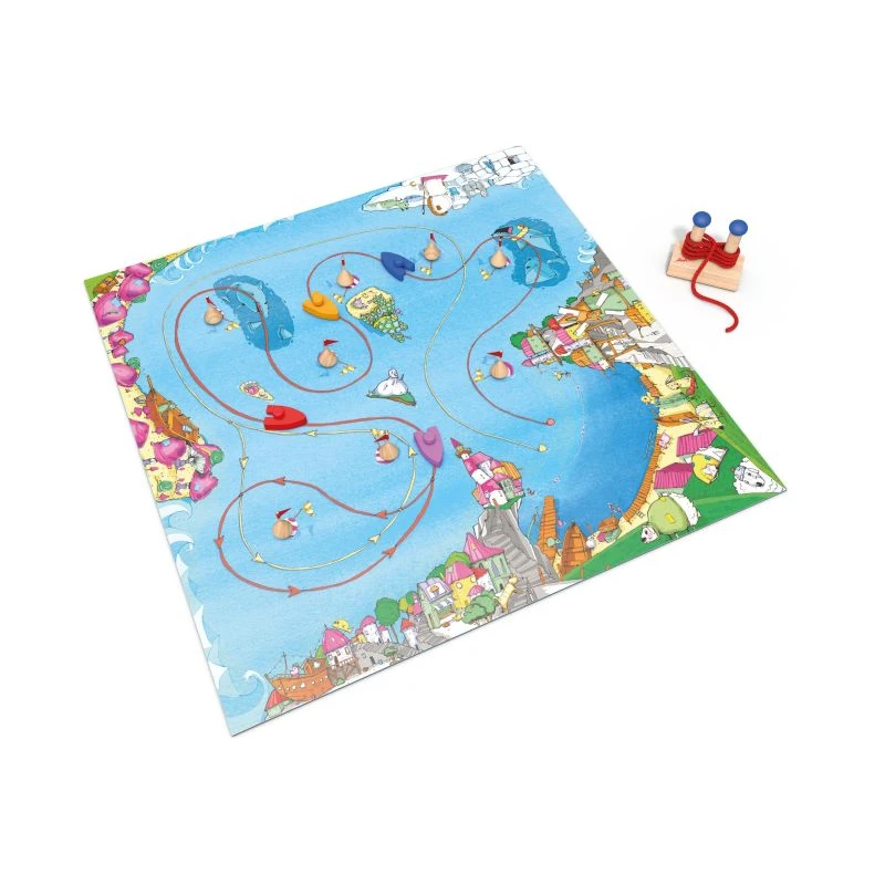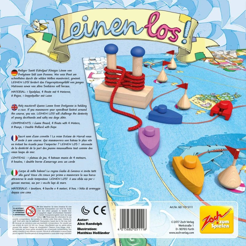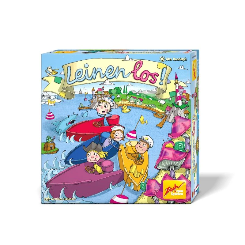 Mit nur einer Fingerspitze lotsen die Spieler ihr Boot um 8 Bojen herum. Das wäre ja kinderleicht… aber diese Boote sind einfach anders: Nur lose miteinander verbunden, sorgen Motor und Bootskörper für einen schlingernden Kurs. Und ein äußerst ungeduldiger Mitspieler wickelt schon mal das Tau um den Poller, um die Bootsetappe zu beenden. Nervenkitzel, Fingerspitzengefühl und eine tolle Ausstattung.