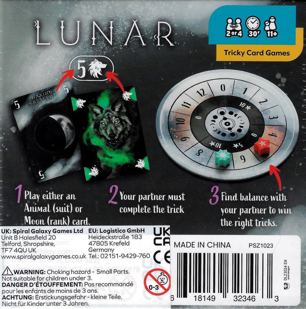 Lunar is a quick-playing, trick-taking game for two or four players in which players combine the phases of the moon and nocturnal animals to form cards played into tricks, which are combined to determine their value within each trick.