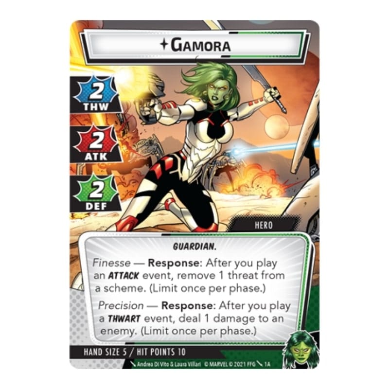 Als Mitglied der Guardians of the Galaxy betritt Gamora mit tödlichem Aufruhr die Bühne in diesem Erweiterungspaket, das Gamora als brandneue spielbare Heldin zusammen mit ihren fünfzehn Signaturkarten vorstellt. Obwohl sie über den Aggressionsaspekt verfügt, ist Gamora insofern einzigartig, als sie auch bis zu sechs Karten mit anderen Aspekten in ihrem Deck haben kann! Da in ihrem vorgefertigten Deck auch die Ereigniskarten „Schutz“ und „Gerechtigkeit“ enthalten sind, können Sie ihr einzigartiges taktisches Gespür sofort ausprobieren. Mit seinem unglaublichen Combo-Potenzial und der Fähigkeit, zuverlässig Schaden zu verursachen und Pläne zu vereiteln, ist Gamora ein vielseitiger Held und ein wertvolles Mitglied jedes Teams. Du wirst froh sein, sie zu haben!