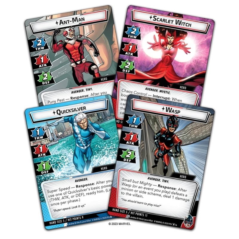 Diese zweite Kollektion enthält alle vier Heldenpakete der zweiten Welle von Marvel Champions-Produkten – Ant-Man, Scarlet Witch, Quicksilver und The Wasp – und vereint sie alle in einem Paket.