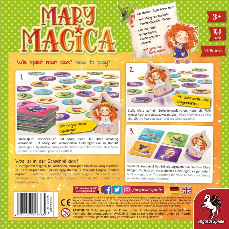 Bei Mary Magica gibt eine Suchkarte vor, welches verzauberte Kleidungsstück Mary gerade finden möchte. Die Spieler sind reihum am Zug, setzen Mary auf eines der Plättchen mit dem entsprechenden Kleidungsstück und heben Mary wieder hoch. Bleibt das Kleidungsstück wie von Zauberhand an ihr hängen, darf der Spieler es an sich nehmen und für den nächsten Spieler wird eine neue Suchkarte aufgedeckt. Bleibt das Kleidungsstück nicht an Mary hängen, ist es nicht verzaubert und der nächste Spieler darf sein Glück versuchen.