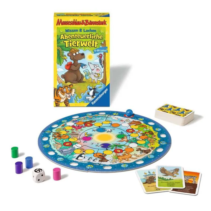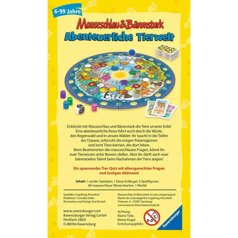 Mit Mauseschlau und Bärenstark entdecken die Spieler die Welt der Tiere. Dabei ziehen sie auf dem liebevoll gestalteten Spielplan durch die Wüste, in den Regenwald, durch die Antarktis, in die Tiefen des Ozeans und durch unsere heimischen Wälder. Unterwegs lernen sie Tiere kennen, die in diesen unterschiedlichen Klimazonen leben. Erreichen die Spieler ein Mauseschlau-Feld, dürfen sie eine Quizkarte ziehen und ihr Tierwissen unter Beweis stellen. Wer die Frage richtig beantworten kann, gewinnt die Karte. Erreichen die Spieler ein Bärenstak-Feld, können sie ihr Talent beim Nachahmen der Tiere zeigen! Während die Spieler ihre Spielfiguren auf dem Spielplan voranziehen, bewegt sich auch die Erde und kreist um die Sonne. Aber anders als in Wirklichkeit, bestimmt der Würfel in diesem Spiel den Lauf der Erde und das Würfelglück bestimmt ihr Tempo. Sobald die Erde einmal um die Sonne gekreist ist, endet das Spiel. Der Spieler, der zu diesem Zeitpunkt die meisten Karten gesammelt hat, gewinnt.