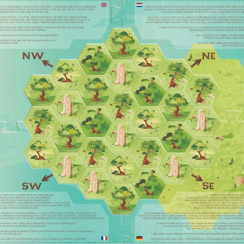 Entdecken Sie als Erster alle Menhire in einer nebligen Landschaft. Passen Sie die Szenerie für jedes neue Spiel zufällig an. Bedecke alle Menhire mit Nebel und füge vier weitere Nebelplättchen hinzu. Verschieben Sie abwechselnd die Nebelplättchen (allein oder in der Gruppe). Der erste, der alle Menhire vom Nebel befreit hat, gewinnt.