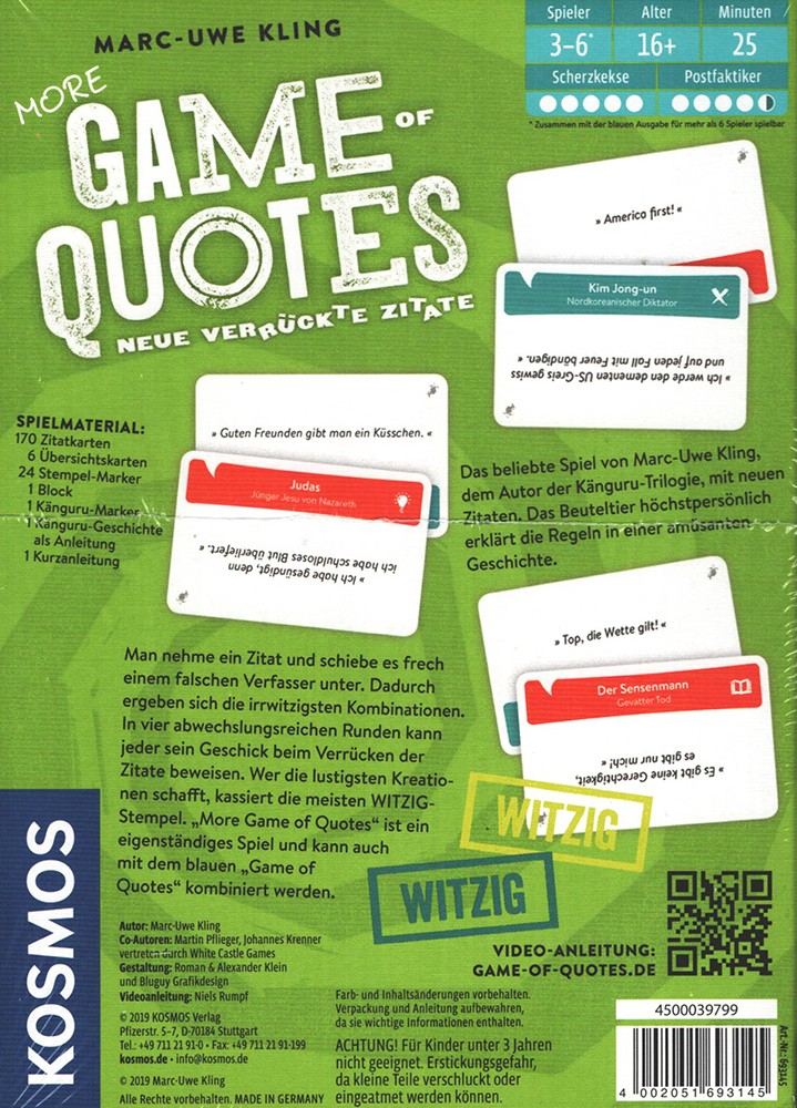Vorsicht, Lachkrampf-Gefahr! Jeder Mitspieler nimmt ein Zitat und schiebt es dreist einem falschen Urheber unter. In vier abwechslungsreichen Runden kann jeder sein Geschick beim Spielen der Zitate beweisen. Wer die absurdesten und lustigsten Kombinationen schafft, erntet die meisten Lacher und heimst auf diesem Weg viele Witzig-Stempel ein. Mit etwas Geschick gewinnt man so das Spiel. 170 Karten sorgen immer wieder für Spaß, Lacher und unvergessliche Spiele-Abende. Ein Muss für alle Marc-Uwe-Kling-Fans! „MORE Game of Quotes“ist ein eigenständiges Spiel und kann mit dem Klassiker „Game of Quotes“ kombiniert werden.