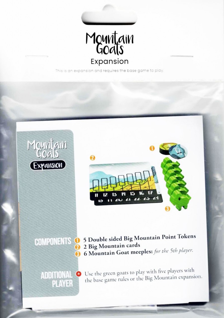 Up the fun by adding The Mountain Goatand The Big Mountainexpansion packs! The Mountain Goatadds more components to allow for a fifth player. The Big Mountainprovides extra points for climbing steep, high-value mountains.