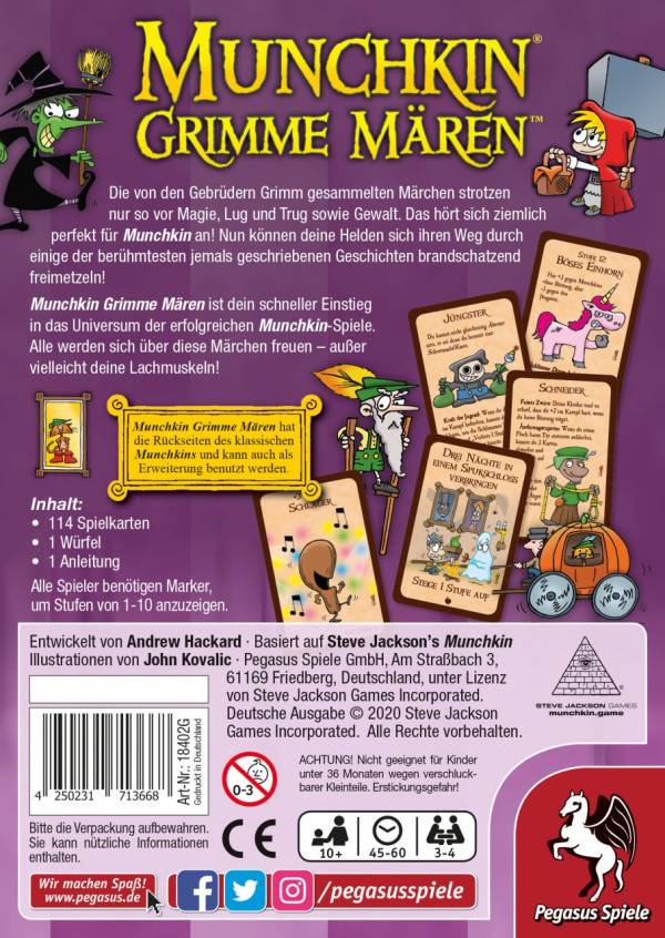 Die Märchen der Brüder Grimm sind voller Magie, Betrug und Gewalt. Wie gemacht für Munchkin! Berühmte Bösewichte und Schätze, wie die böse Stiefmutter oder Rapunzels goldene Locken, werden auf über 100 Karten mit neuem Artwork von John Kovalic eingefangen.