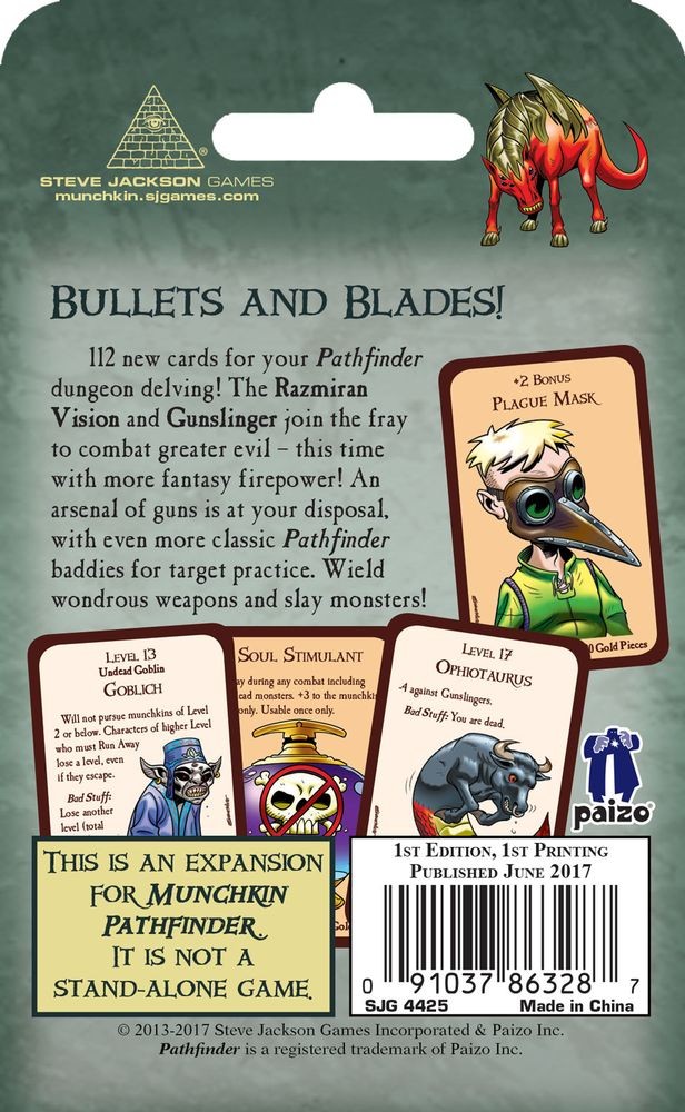 In this expansion, you get a new class and a new faction for the hit game Munchkin Pathfinder! You can become a Gunslinger and shoot ‚em up in the popular Pathfinder setting. Or you can join the Razmiran Vision, a new faction that benefits from backstabbing. (What could be more Munchkin?) Plus, there are plenty of new Monsters and Treasures in this 112-card supplement.