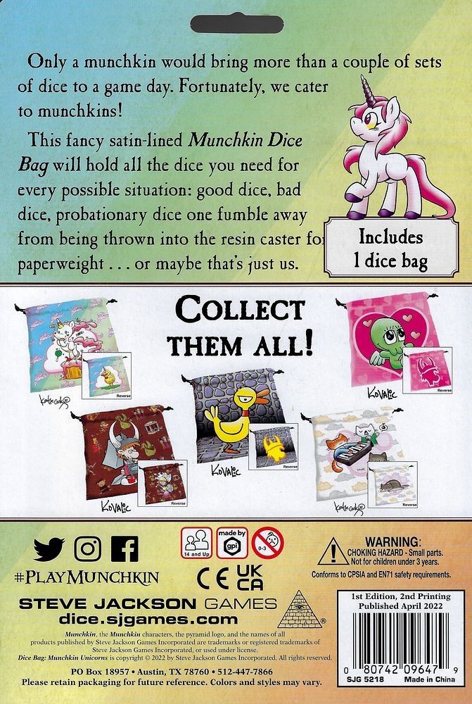 From Steve Jackson Games: This fancy satin-lined Dice Bag: Munchkin Unicorns is the… mehr Menü schließen Produktinformationen „Munchkin: Unicorns – Dice Bag“