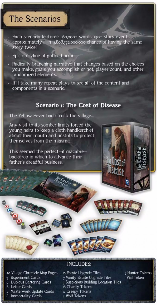 In My Father’s Work, 2-4 players play competing mad scientists entrusted with a page from their father’s journal, along with a large estate in which to perform their devious experiments. Players earn points by completing Experiments, aiding the Town in its endeavors, and hopefully completing their Father’s Work in this app-driven branching-narrative game.