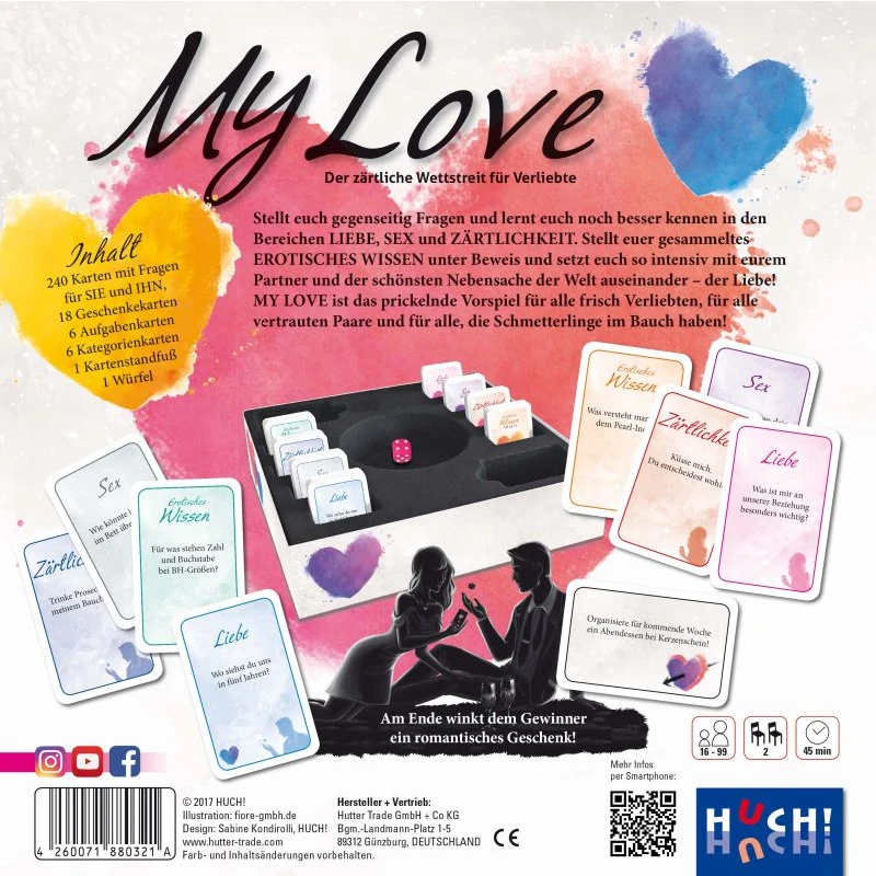 Stellt euch gegenseitig Fragen und lernt euch noch besser kennen in den Bereichen Liebe, Sex und Zärtlichkeit. Stellt euer gesammeltes erotisches Wissen unter Beweis und setzt euch so intensiv mit eurem Partner und der schönsten Nebensache der Welt auseinander – der Liebe! MY LOVE ist das prickelnde Vorspiel für alle frisch Verliebten, für alle vertrauten Paare und für alle, die Schmetterlinge im Bauch haben!