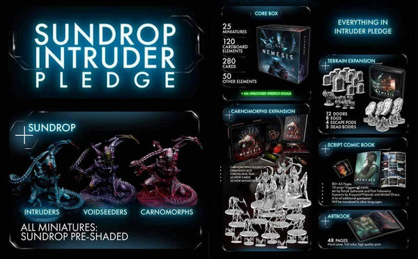 Content Notes:Kickstarter Edition of the Sundrop Intruder All-in Pledge for Nemesis: The Board Game. Includes Core Game, Voidseeders Stretch Goal Box, Aftermath Expansion, Carnomorphs Expansion, Terrain Expansion, Script Comic Book, Art Book, and all other met stretch goals. All miniatures will receive „sundrop“ pre-shaded treatment. Please note: unless otherwise stated paid add ons from the Kickstarter Campaign are not included.