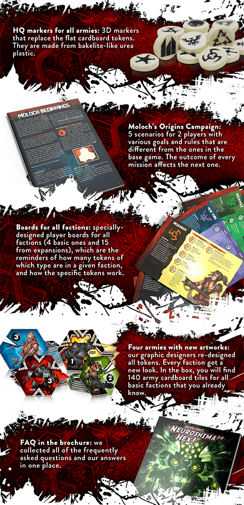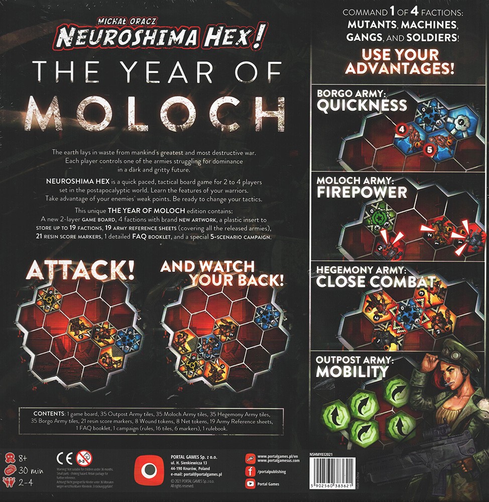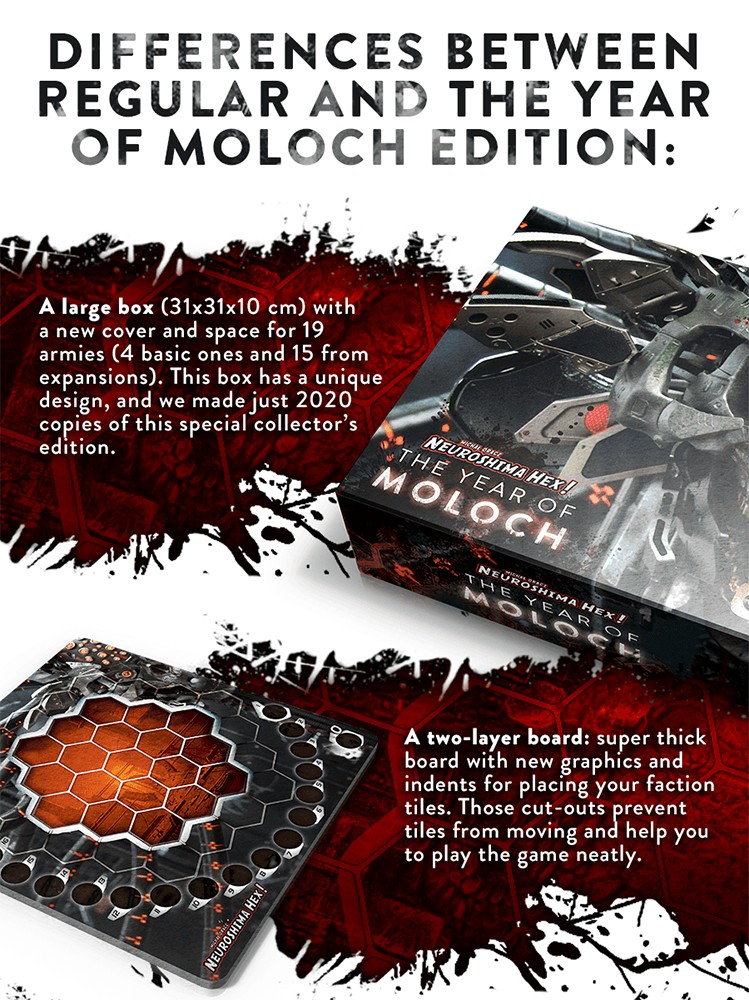 Neuroshima Hex – The Year of Molochis an anniversary edition of Neuroshima Hex published by Portal Games to celebrate 2020 – The Year of Moloch. This limited edition printed only in 2020 copies includes double-layered board with new artwork, dedicated reference charts for all armies, new campaign about the beginnings of Moloch, new art and HQ plastic bits for all armies, big box with an insert designed to fit all 19 armies.