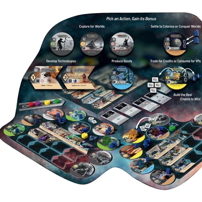 Die Spieler werden Welten erobern und ihnen besondere Kräfte und Güter zur Verfügung stellen. Sie können die Waren gegen Geld eintauschen oder sie für Siegpunkte verbrauchen. Das Spiel wird so lange fortgesetzt, bis mindestens eine der vier Endbedingungen erfüllt ist. Dann gewinnt der Spieler mit den meisten Siegpunkten.