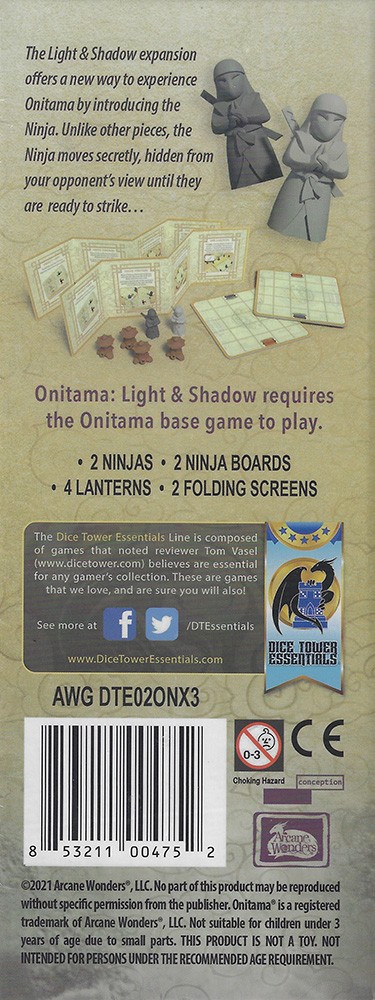 The Onitama: Light and Shadowexpansion offers a new way to explore the elegant and simple game of martial tactics by introducing a new type of pawn: The Ninja. Unlike other pawns, the Ninja moves secretly, hidden from your opponent’s view until they are ready to strike…