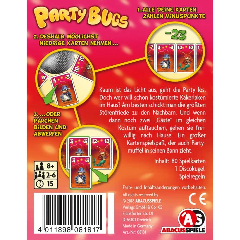 Kaum ist das Licht aus, geht die Party los. Doch wer will schon eine Kakerlaken-Kostüm-Fete in seiner Wohnung? Am besten schickt man die fettesten Schädlinge zu den Nachbarn. Und wenn zwei Partygäste im gleichen Kostüm auftauchen, gehen die ohnehin peinlich berührt nach Hause. Ein großer Kartenspielspaß, der auch Partymuffel in seinen Bann zieht.