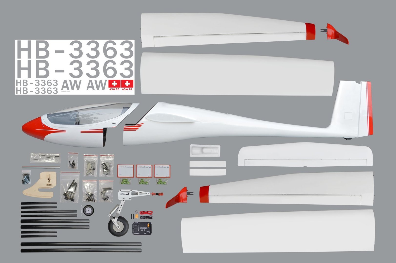 Die ASW-28 von Phoenix Model ist ein großer Segelflieger mit 5.5m Spannweite in klassischem Design, wie er auf vielen Segelflugplätzen der manntragenden Zunft anzutreffen ist. Das Modell ist in hervorragender Qualität als fertig bespannte Holzkonstruktion gefertigt. Die ASW-28 verfügt über einen geteilten Rumpf und eine zweiteilige Tragfläche, so dass der Transport auch mit einem „normalen“ Auto möglich ist.