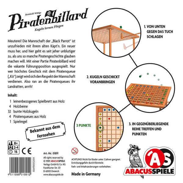 Angeblich ist es wilden Piraten zu verdanken, daß wir heute Piratenbillard spielen können. Mit sonderlich geformten Holzschlägern werden Kugeln über das große Spielbrett getrieben. Dabei schlägt man von unten gegen das Leinentuch, um die Kugeln weiterzubefördern. Auf dem Weg zur gegenüberliegenden Seite versucht man auch gegnerische Kugeln zu fangen. Einmal ausprobiert läßt einen dieses Spiel nicht mehr los. Ein einfach toller Spaß für die ganze Familie.