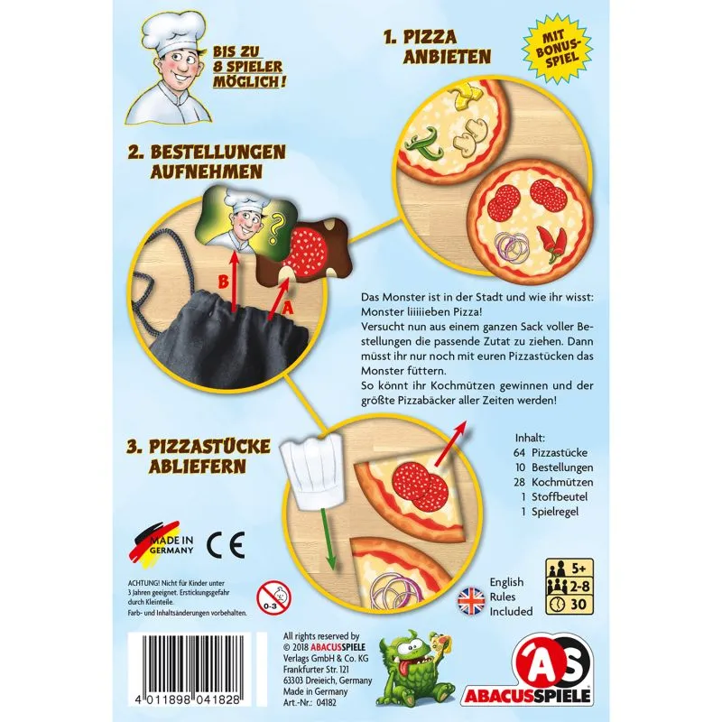 Das Monster ist in der Stadt und wie ihr wisst: Monster liiiiieben Pizza! Versucht nun aus einem ganzen Sack voller Bestellungen die passende Zutat zu ziehen. Dann müsst ihr nur noch mit euren Pizzastücken das Monster füttern. So könnt ihr Kochmützen gewinnen und der größte Pizzabäcker aller Zeiten werden!