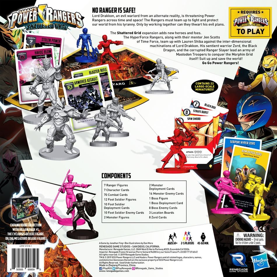The Shattered Grid expansionadds new heroes and foes. The HyperForce Rangers, along with their mentor Jen Scotts of Time Force, team up with Lauren Shiba against the inter-dimensional machinations of Lord Drakkon. His sentient warrior Zord, the Black Dragon, and the corrupted Ranger Slayer lead an army of Mastodon Troopers to conquer the Morphin Grid itself! Suit up and save the world! Go Go Power Rangers!