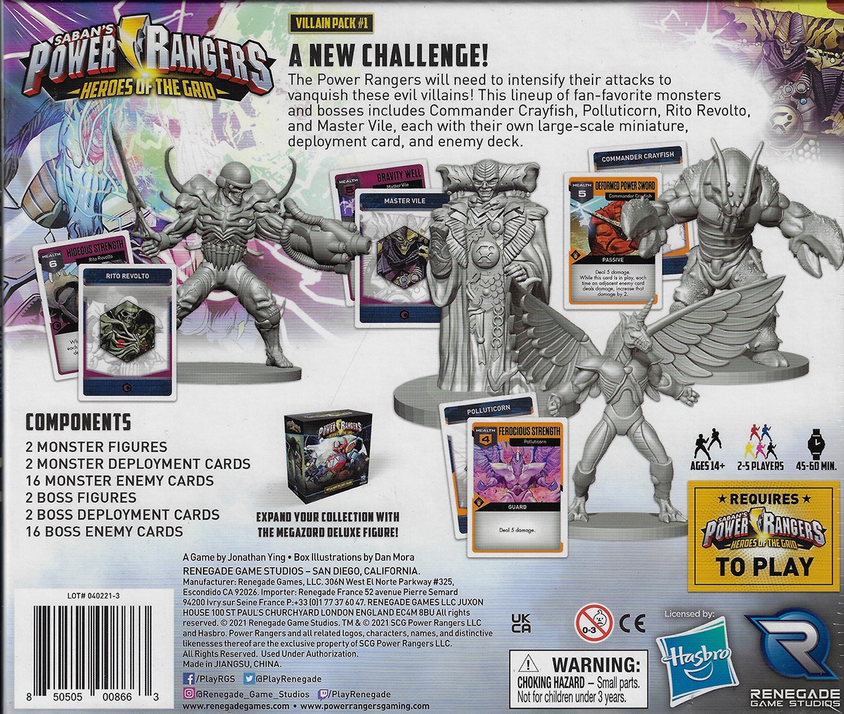 A new challenge! The Power Rangers will need to intensify their attacks to vanquish these evil villains! This lineup of fan-favorite monsters and bosses includes Commander Crayfish, Polluticorn, Rito Revolto, and Master Vile, each with their own large-scale miniature, deployment card, and enemy deck.