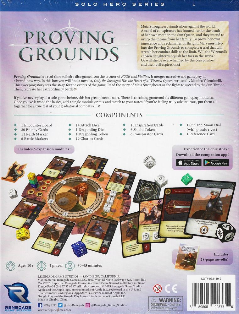 Proving Groundsis a real-time solitaire dice game from the creator of FUSE and Flatline. It merges narrative and gameplay in a brand-new way. In this box, you will find a novella, Only the Strongest Has the Heart of a Wizened Queen, written by Monica Valentinelli. This sweeping story sets the stage for the events of the game. Read the story of Maia Strongheart as she fights to ascend to the Sun Throne. Then, recreate her extraordinary battle!