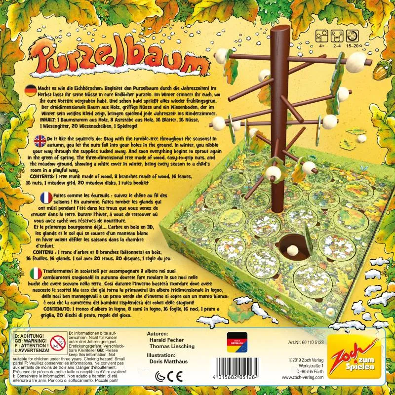 Im Sommer gereift, purzeln die Nüsse im Herbst von den Bäumen. Schlaue Eichhörnchen vergraben sie in ihren geheimen Verstecken, um sich im Winter durch die Vorräte knabbern zu können. Bei Purzelbaum schlüpfen die Spieler selbst in die Rolle von Eichhörnchen. Sie lassen im Herbst Nüsse von den Ästen in ihre frisch gegrabenen Erdlöcher purzeln. Im Winter, wenn alles weiß ist, erinnern sie sich an die Verstecke, in denen sich besonders viele Nüsse befinden.