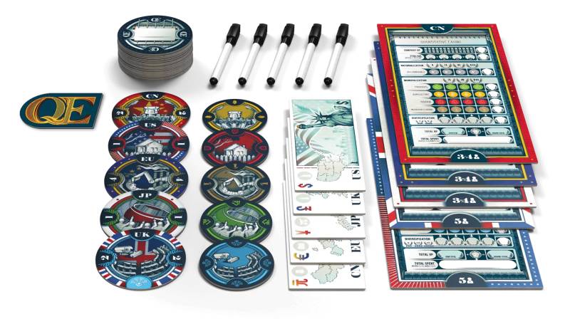 In Q.E., a term that stands for „quantitative easing“, you play the role of a central bank. You bid on different size companies to accumulate various levels of victory points. The amount you bid is unlimited since you are the central bank and you own the printing press! After the initial „open“ bid by the lead player, the other players bid in secret. After the sixteen companies have been „bailed out“, bonus victory points are awarded for company sets of nationalization, monopolization, and diversification.