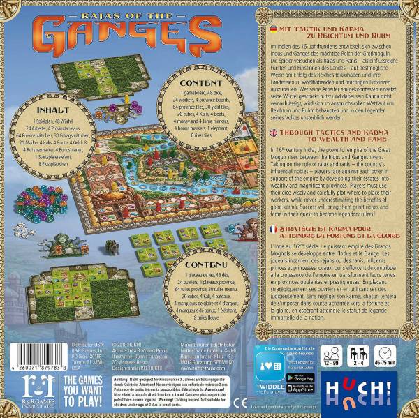 Provinzen auszubauen. Ohne die Rolle des Karmas zu unterschätzen, versuchen die Spieler als Rajas, sich in einem anspruchsvollen Zusammenspiel von Ansehen und Reichtum am vortrefflichsten zu behaupten. Wer wird am Ende in den Legenden seines Volkes unsterblich werden? Mit gegenläufigen ZählleistenMit Würfeln und Workern zu Reichtum und Ruhm