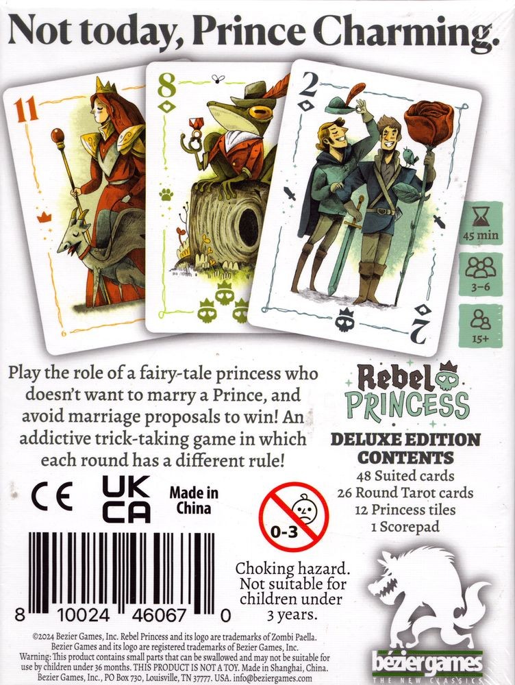 Rebel Princess Deluxe Editionis a delightfully diabolical trick-taking card game for 3-6 players that is similar, yet thoughtfully different, from the classic game of Hearts. Instead of avoiding Hearts, players are avoiding Prince Cards as they each represent one marriage proposal. Beware the very eager Frog Prince who’s worth 5 marriage proposals! Receive the fewest marriage proposals and become the legendary Rebel Princess.