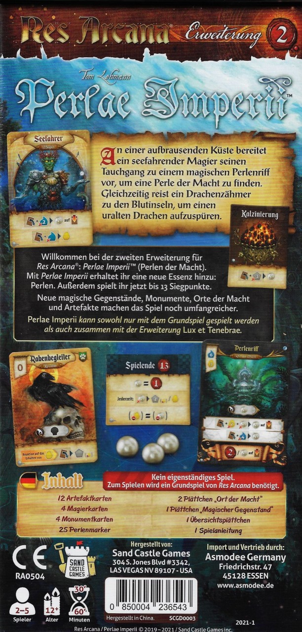 Willkommen bei der zweiten Erweiterungfür Res Arcana: Perlae Imperii(Perlen der Macht). Mit Perlae Imperii erhaltet ihr eine neue Essenz hinzu: Perlen. Außerdem spielt ihr jetzt bis 13 Siegpunkte. Neue magische Gegenstände, Monumente, Orte der Macht und Artefakte machen das Spiel noch umfangreicher.