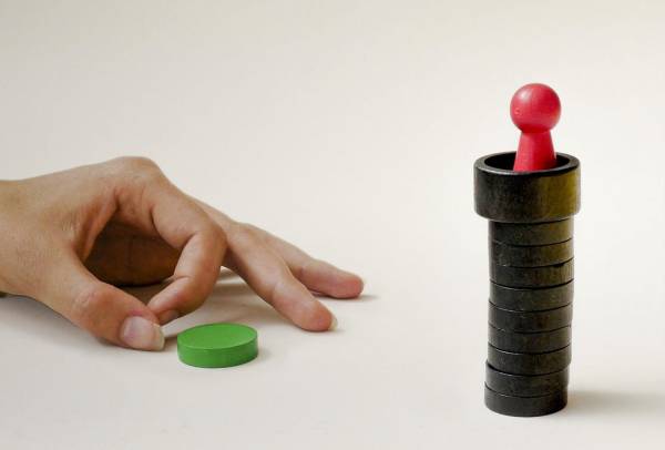 Mit Hilfe einer Holzscheibe und etwas Treffsicherheit können wir jeweils die unterste Etage des Turms herausschnippen – ohne, dass das Gebäude umstürzt! Das Gesetz der Schwerkraft machts möglich. Natürlich gelingt es nicht immer – wäre auch langweilig? Die Anderen wollen schließlich auch mal an die Reihe kommen.
