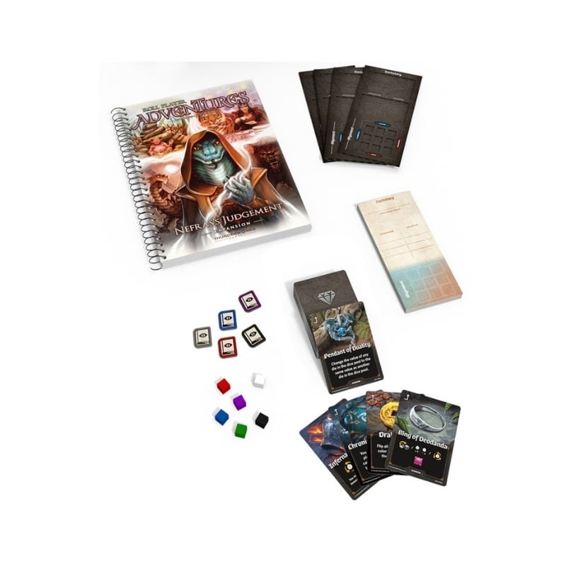 Die Roll Player Adventures-Erweiterung „Nefras‘ Judgement“ enthält 41 verschiedene Hintergrundgeschichten-Quests, eine für jede Hintergrundgeschichtenkarte in Roll Player. Diese Quests sind in die Kerngeschichte der Kampagne eingebunden und beinhalten Begegnungen, bei denen jeder Spieler Entscheidungen treffen kann, die seine Ausrichtung anpassen.